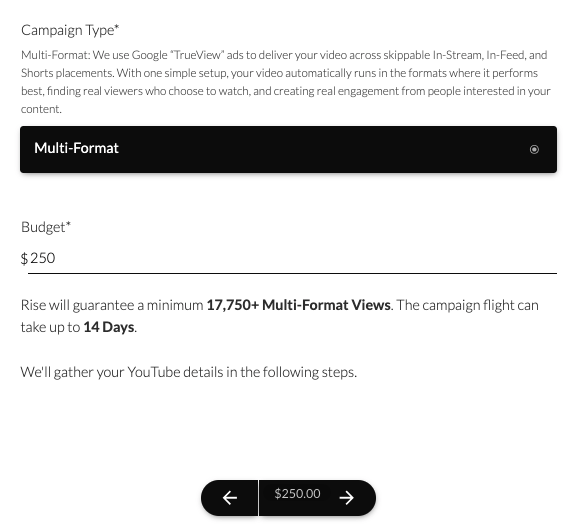 Next up, select your preferred targeting, campaign type, and enter your budget. Rise will tell you exactly how many views we can guarantee based on your inputs. You may enter any budget you like and preview the guaranteed results before you pay for a campaign. Go to https://rise.la/create to experiment with optimization and budget to see what results Rise will guarantee. Larger budgets will guarantee larger results, and will take longer to run. If you ever have questions about allocating your budget, you can always email a growth expert: https://rise.la/contact-us