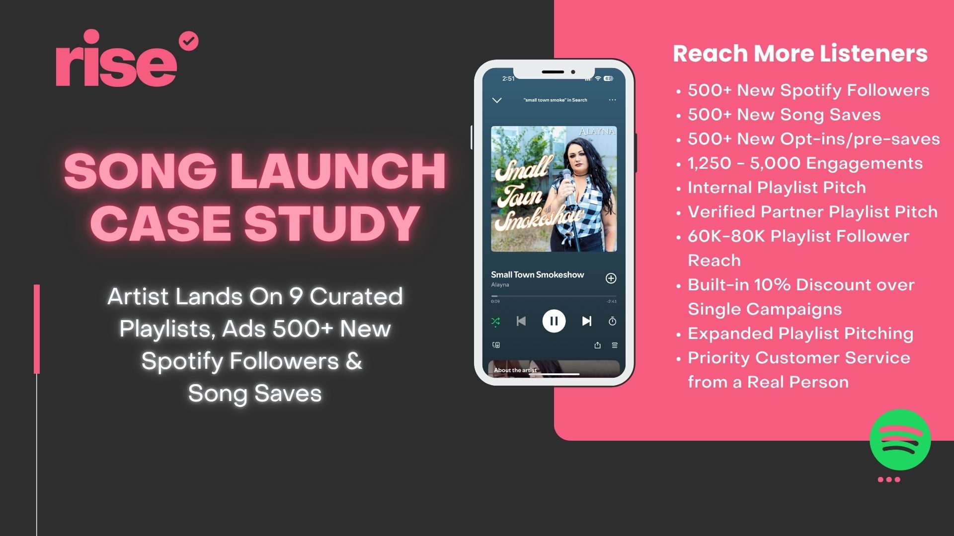 Country Artist Alayna recently ran a Song Launch Campaign, and earned 520 New Spotify Followers, Song Saves, and opt-ins for future pre-saves. The campaign earned 2,116 Engagements, as she was placed on nine curated playlists, and Landed on Radio, Discover Weekly, Mixes, Smart Shuffle, Release Radar.
